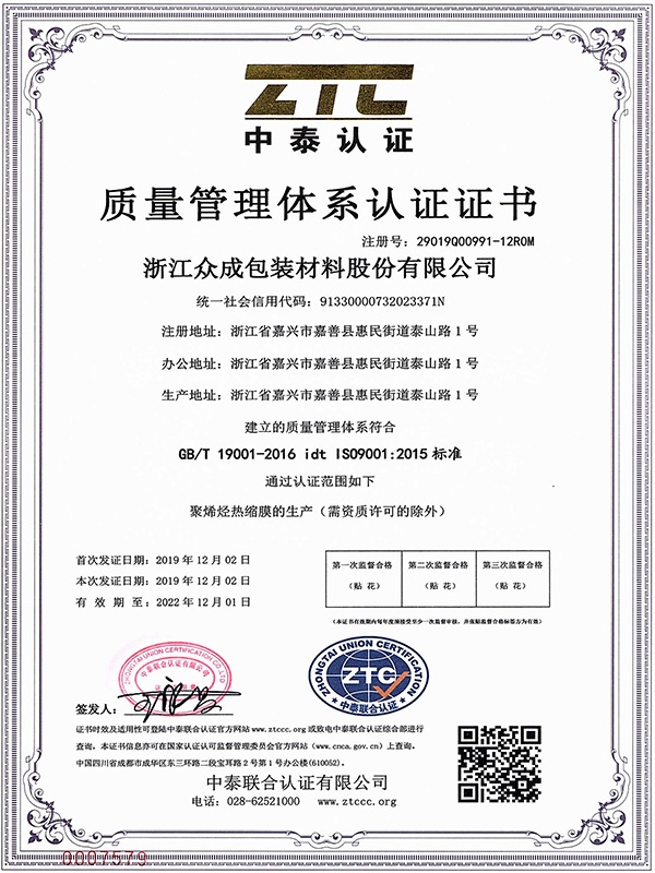 浙江眾成包裝材料股份有限公司成立于2001年,是一家集科研、設(shè)計、生產(chǎn)、銷售及售后服務(wù)于一體的全過程制造企業(yè),是全球知名的高品質(zhì)POF熱收縮膜制造商和POF熱收縮膜整體包裝解決方案提供商。