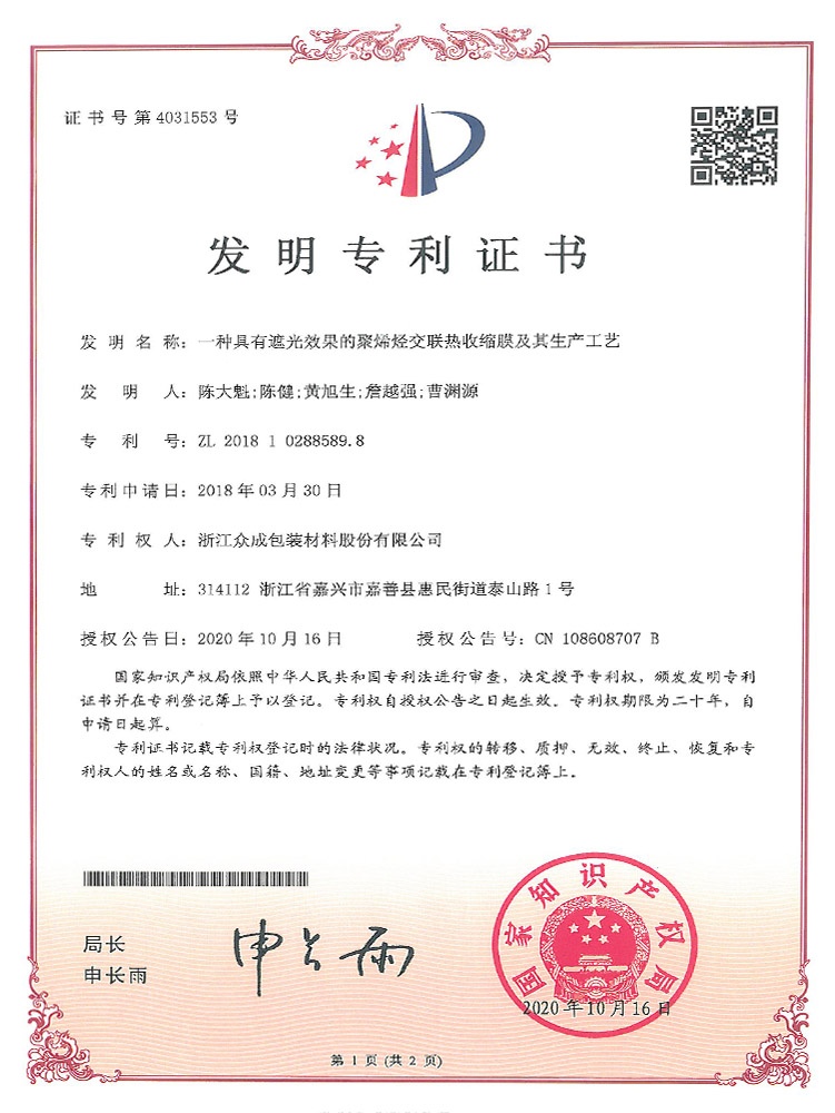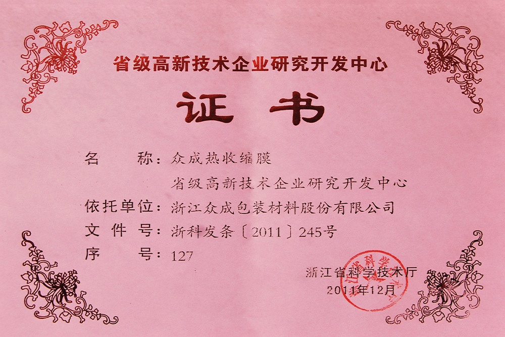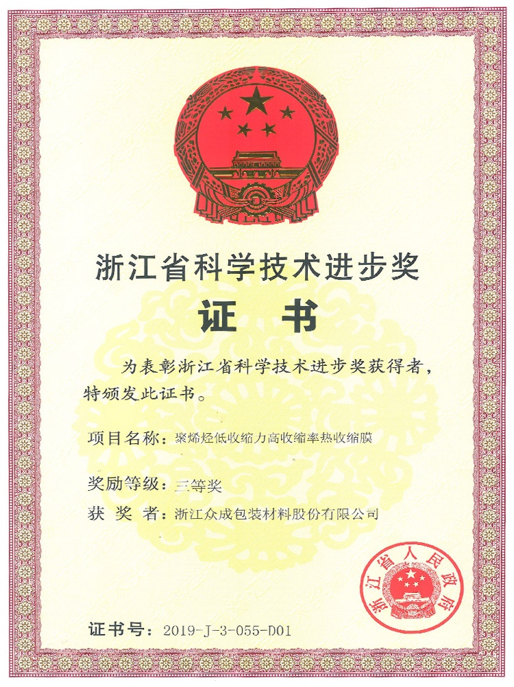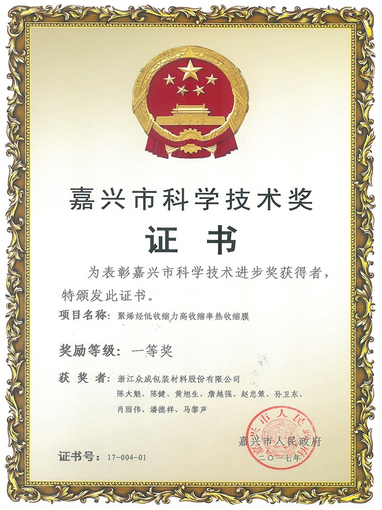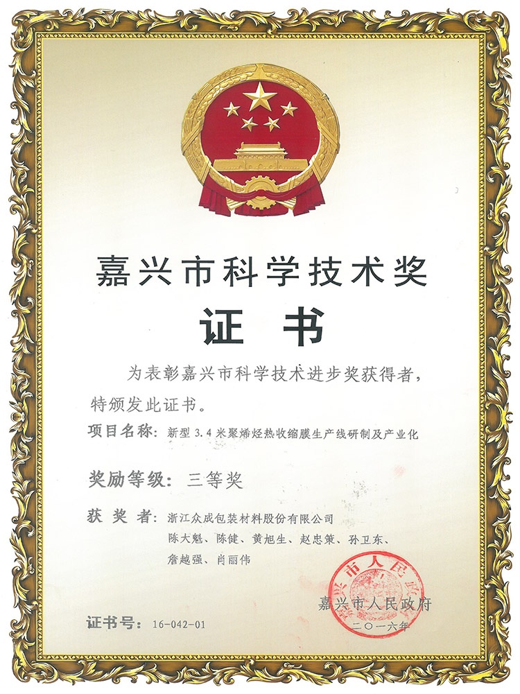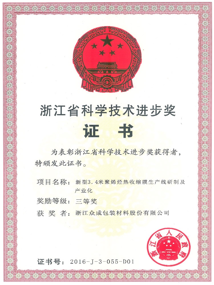 公司秉承“贏在領(lǐng)先”的企業(yè)精神,堅(jiān)持核心設(shè)備自制,不斷在新產(chǎn)品、新工藝上取得創(chuàng)新,已累計(jì)獲得知識產(chǎn)權(quán) 48 項(xiàng),其中發(fā)明專利 21 項(xiàng)。先后開發(fā)了 POF 普通膜和POF交聯(lián)膜,并在此基礎(chǔ)上進(jìn)一步研發(fā)了聚烯烴高性能(低溫)熱收縮薄膜、聚烯烴高收縮(交聯(lián))薄膜、包裝用超低收縮力熱收縮膜、包裝用聚烯烴超薄熱收縮薄膜等產(chǎn)業(yè)化新產(chǎn)品,多次承擔(dān)火炬計(jì)劃項(xiàng)目,獲得浙江省科學(xué)技術(shù)進(jìn)步獎(jiǎng)三等獎(jiǎng)4次、嘉興市科學(xué)技術(shù)獎(jiǎng)一、三等獎(jiǎng)各1次,嘉善縣科學(xué)技術(shù)進(jìn)步獎(jiǎng)一等獎(jiǎng)2次。